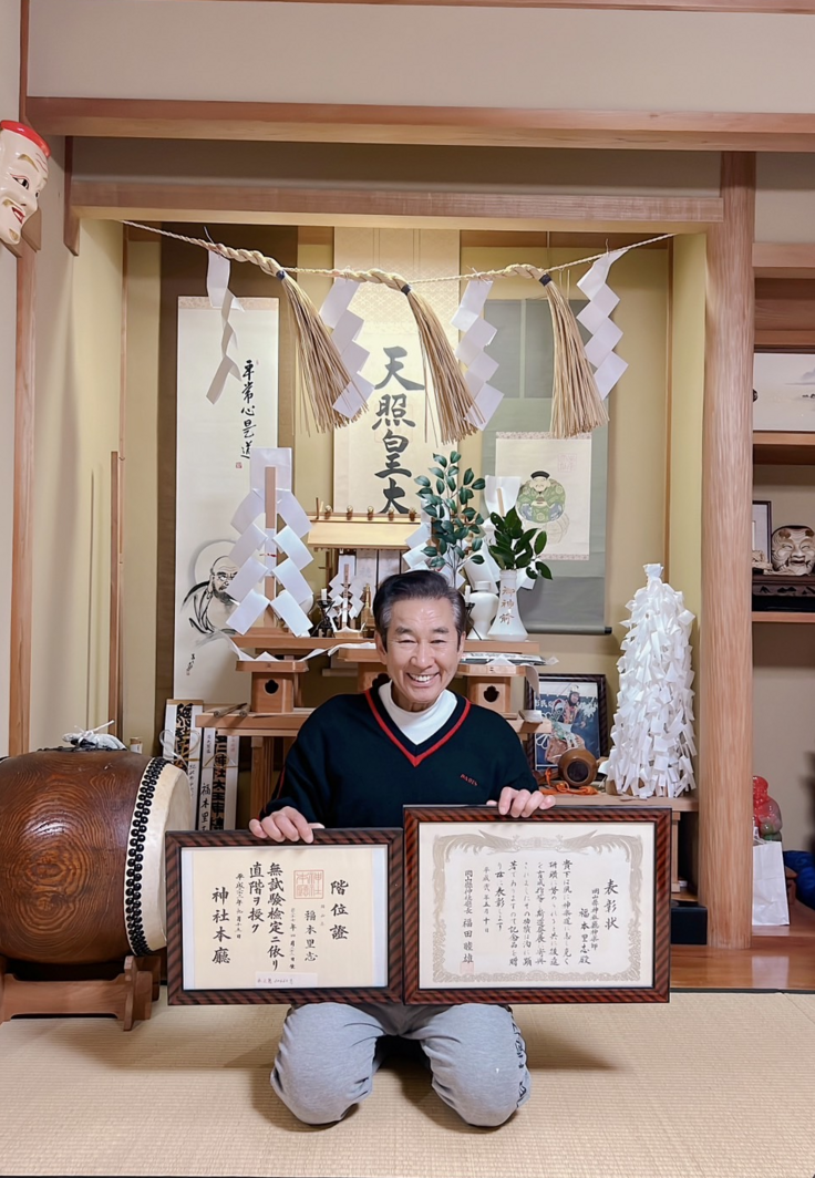 さて、私は、21歳から49年間、総社社中のメンバーとして、そして、備中神楽の神楽太夫として、地元周辺の秋祭りをはじめ、国内外の様々なところでも備中神楽を舞ってまいりまして、多くの良き学びをさせていただきました。お陰様で、今年は神社庁より50年の表彰を拝受する予定です。