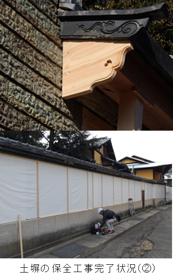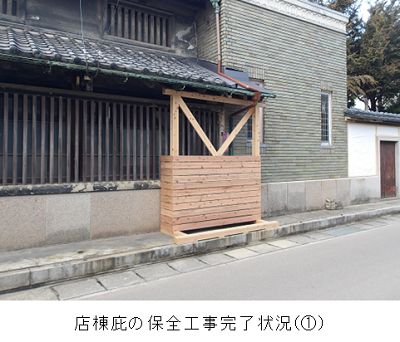 昨年11月から開始された主屋棟食堂・和室・仏間・店棟及び土塀(RC造)保全工事は、①主屋棟(和室と食堂)と店棟の庇には支持材を設置、②土塀に防水シートを被覆し、2月末日で完了しました。これによって今後の修繕に向けて、主屋棟と店棟の庇、土塀の崩壊を抑えることができるようになりました。