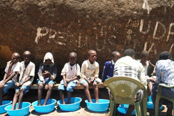 治療経験のある現地NGOや、医学生、ボランティアの方々に協力してもらいながら行います。治療では、過マンガン酸カリウム(ソーダアッシュ)を薬として使います。過マンガン酸カリウムを溶かしたぬるま湯に足を20分程度浸けることで、写真(下記参照)のように誰でも簡単に治療を施すことができます。