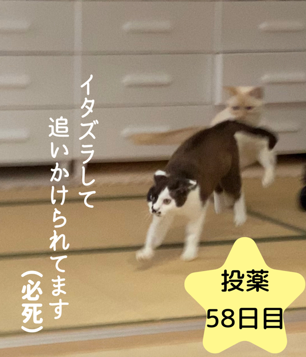 今日の写真は、ちくわ兄ちゃんにちょっかい出しすぎて追いかけられるがんもです😂