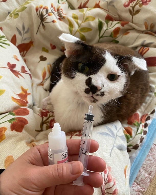 今は、朝ステロイド1錠、夜FIP治療薬5錠、朝昼晩目薬を頑張っています!