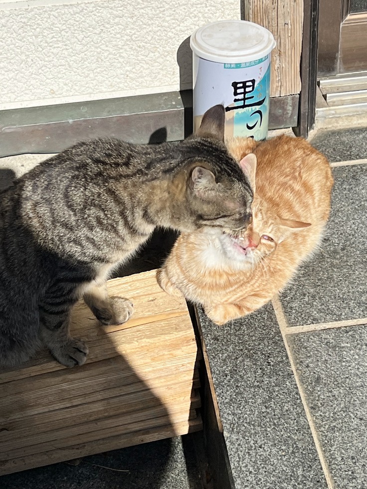 茶虎ちゃんが少し風邪気味で、体調不良みたいでした。その子を心配してペロペロしてあげるお兄ちゃん猫。ほっこりする家族愛の一枚です。