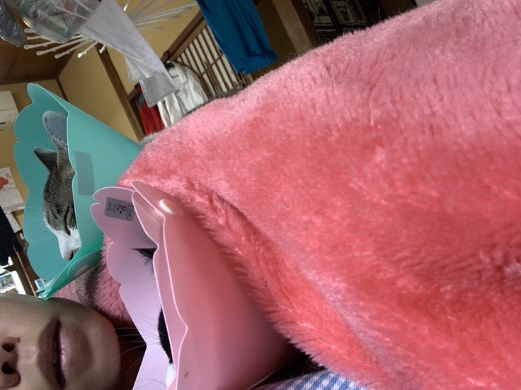 特に霧島くんは撫でようとすると走って逃げる子だったんですが、今は大人しく撫でられるのが好きになったみたいです。キャットタワーの頂上にたたずむ、エリザベスカラー装着バージョンの霧島君は、ラッパに見えるのでラピュタのパズーの様でした(笑)