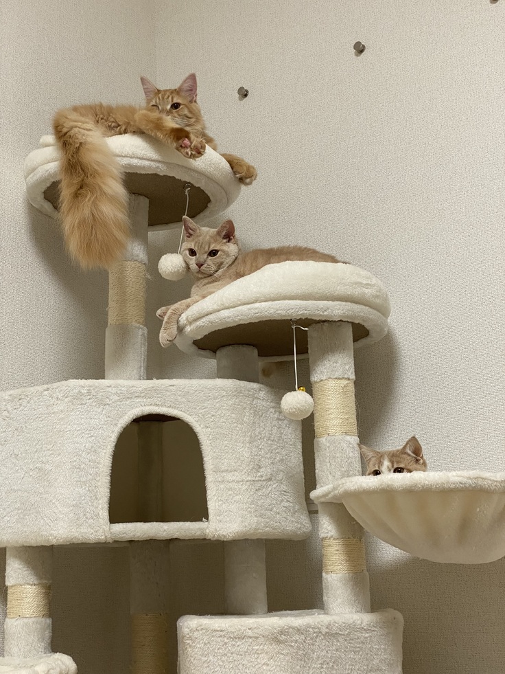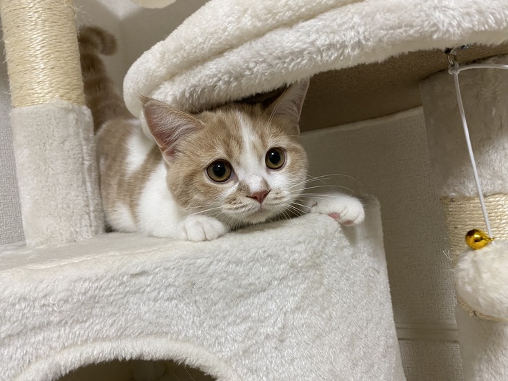 キャットタワーに登るのが大好きなもちまる。本当に可愛くて仕方ないです。