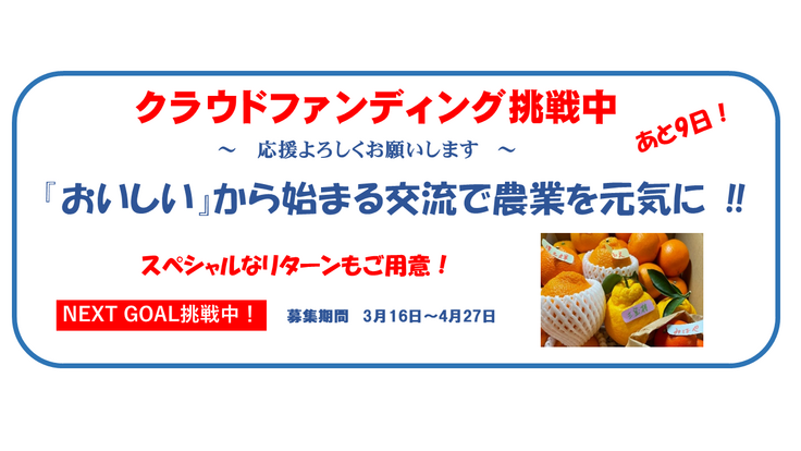 本日(4月18日)、NEXT GOAL(120万円)を掲げ、挑戦を継続することにいたしました。4月27日(木)23:00まで。残すところあと9日。首都圏マルシェでのPRなど、きわめてアナログな取組みで支援を呼び掛けてまいりました。マルシェでは「おいしい!」という評価をたくさん頂戴しています。「新鮮・完熟・産地ならでは!」この取組みを本格化させるため、是非応援をよろしくお願いします。