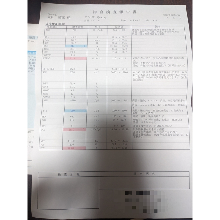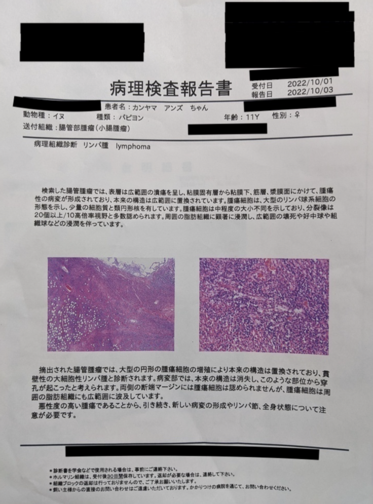 9月28日に開腹手術をしまして摘出された内臓を病理検査に出したところ10月3日報告書にてあんずちゃんは悪性のリンパ腫と診断され現在、抗がん剤治療中です。
