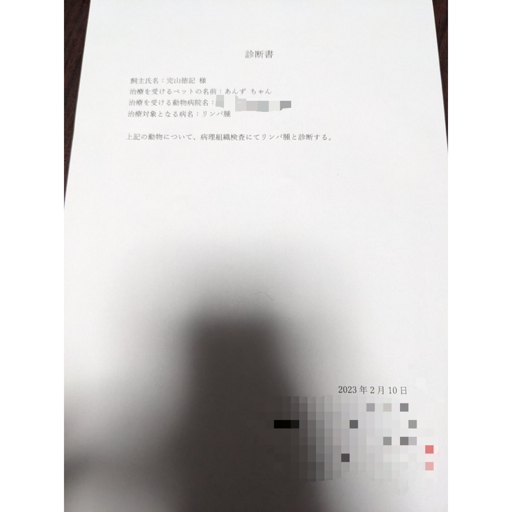 先生の頑張りもあり、なんとか膵炎は乗り越えてくれたんですが、その後すぐ、触手検査でお腹に腫瘍みたいなしこりを発見して、血液検査、エコー検査したのち手術で内臓の一部を摘出。なんとか体調はよくなったんですが、その一部を病理検査に出したところ、悪性のリンパ腫と診断され現在、抗がん剤治療中です。