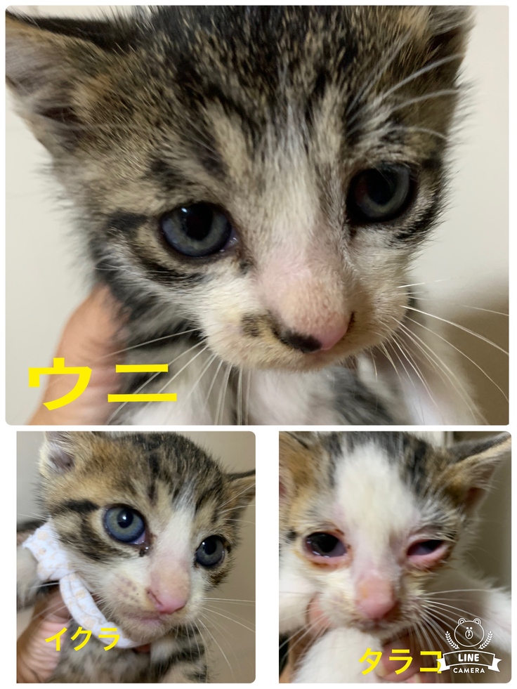 依頼者様から保護依頼を受け預かりスペースも無く一度はお断りをしましたが、「カラスに襲われてるのに知らないよ」と言われ、確保するスペースを用意し保護に至りました。9匹の子猫が目も潰れかけ蹲ってました。