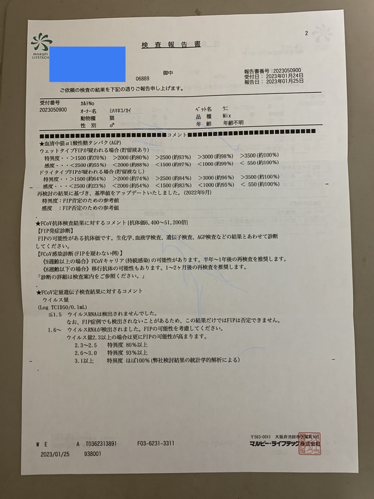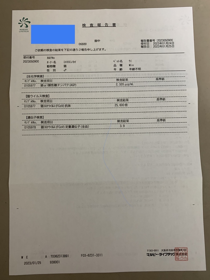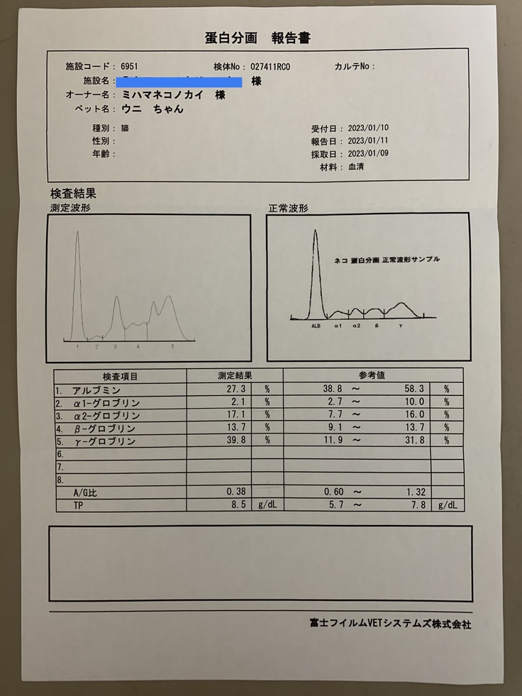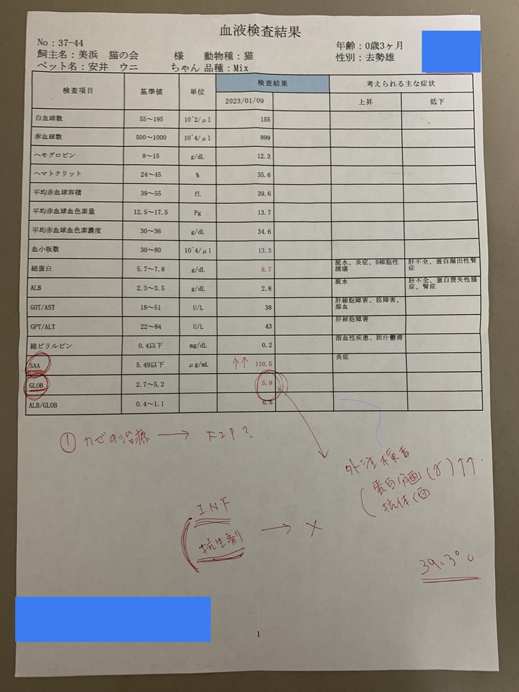 SAA値、グロブリン値も高いが、風邪の場合でも数値は上がるので、まず風邪の治療をして改善されなければ、FIPの可能性もあるとの事で、