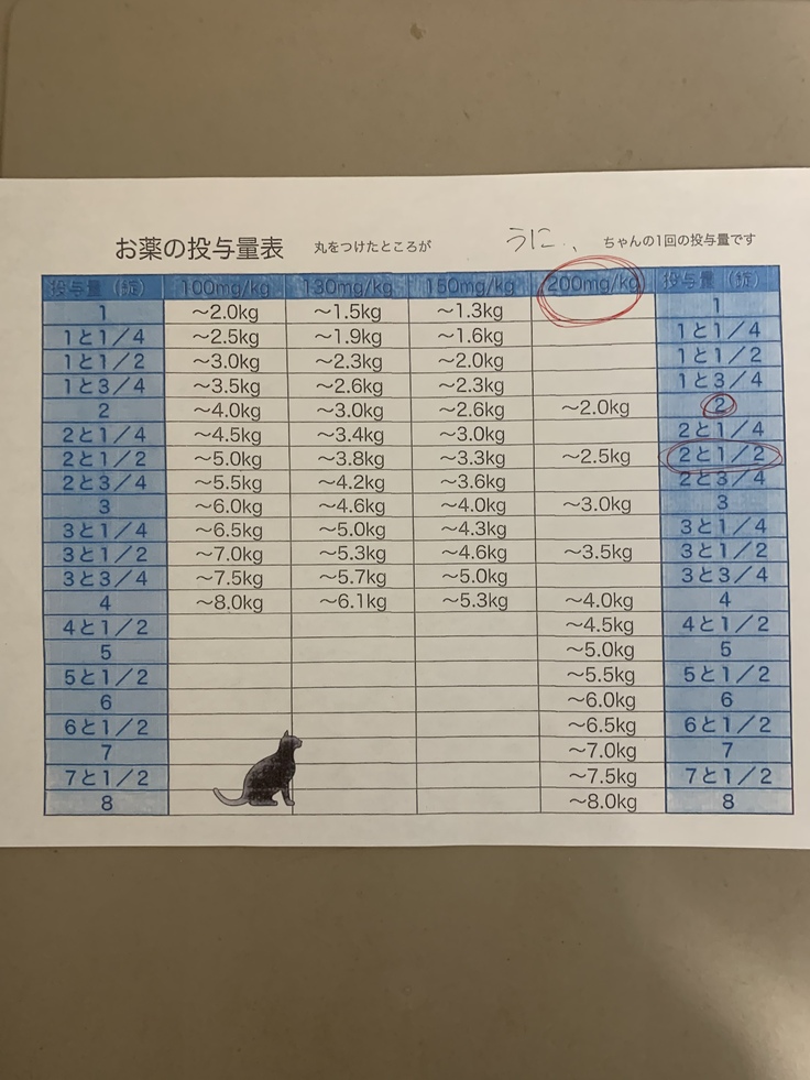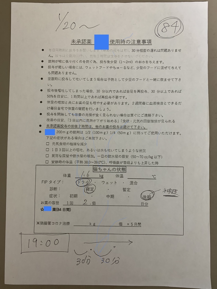 84日間の治療として、治療薬の錠剤の投与と体重測定を毎日行い、錠剤は体重にあわせて量を調整します。また、FIPに良く効くとされるサプリメントも投与していきます。