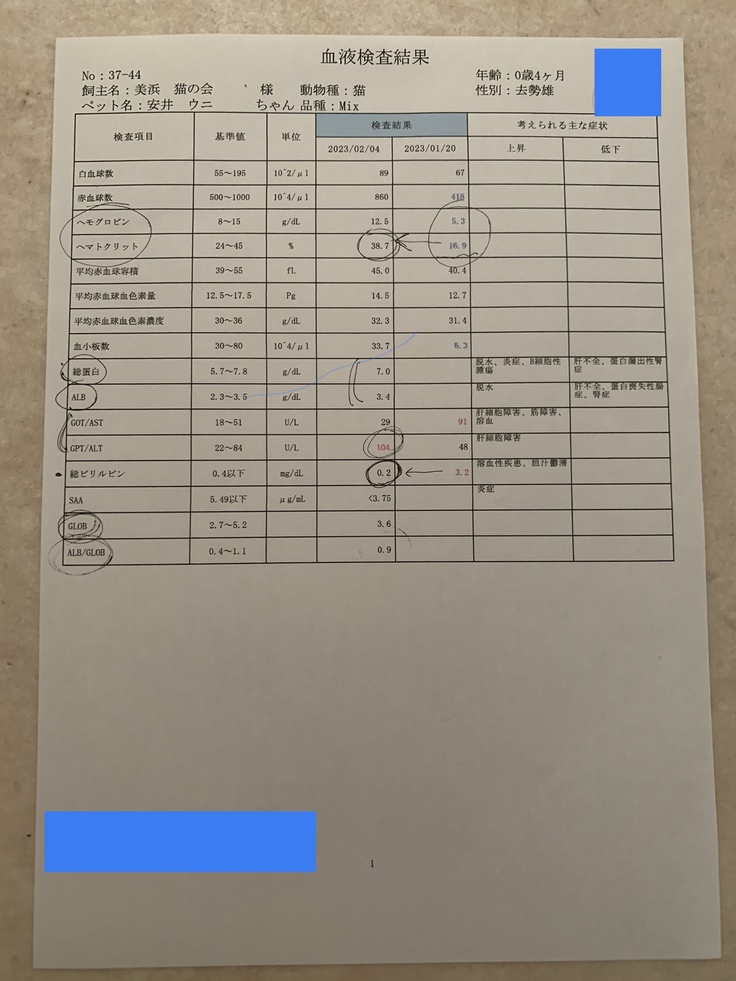 黄疸と貧血が酷く、神経症状もあり、目も光を感じる事がないようで、おそらく見えていないだろうとの事でした。