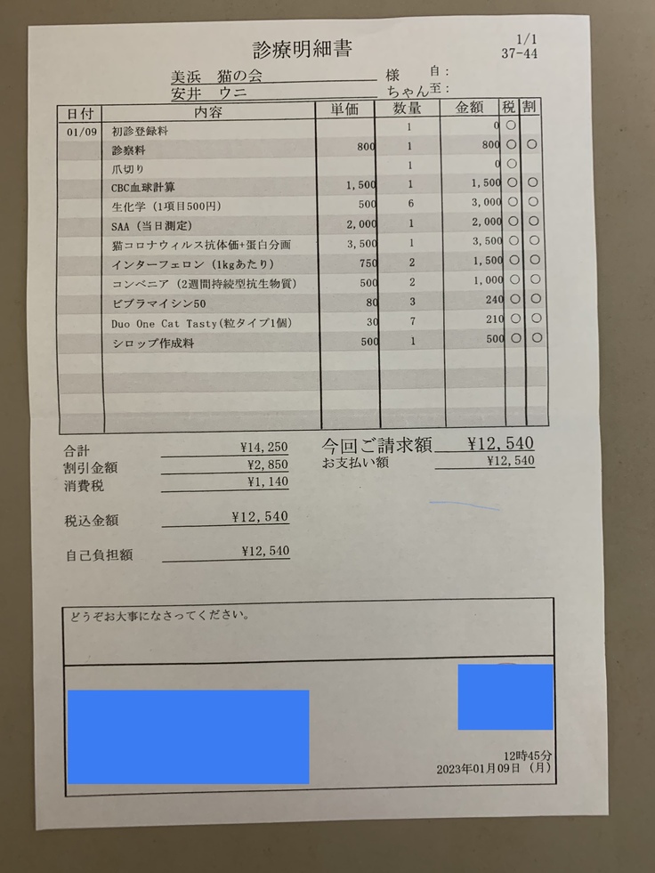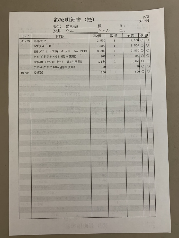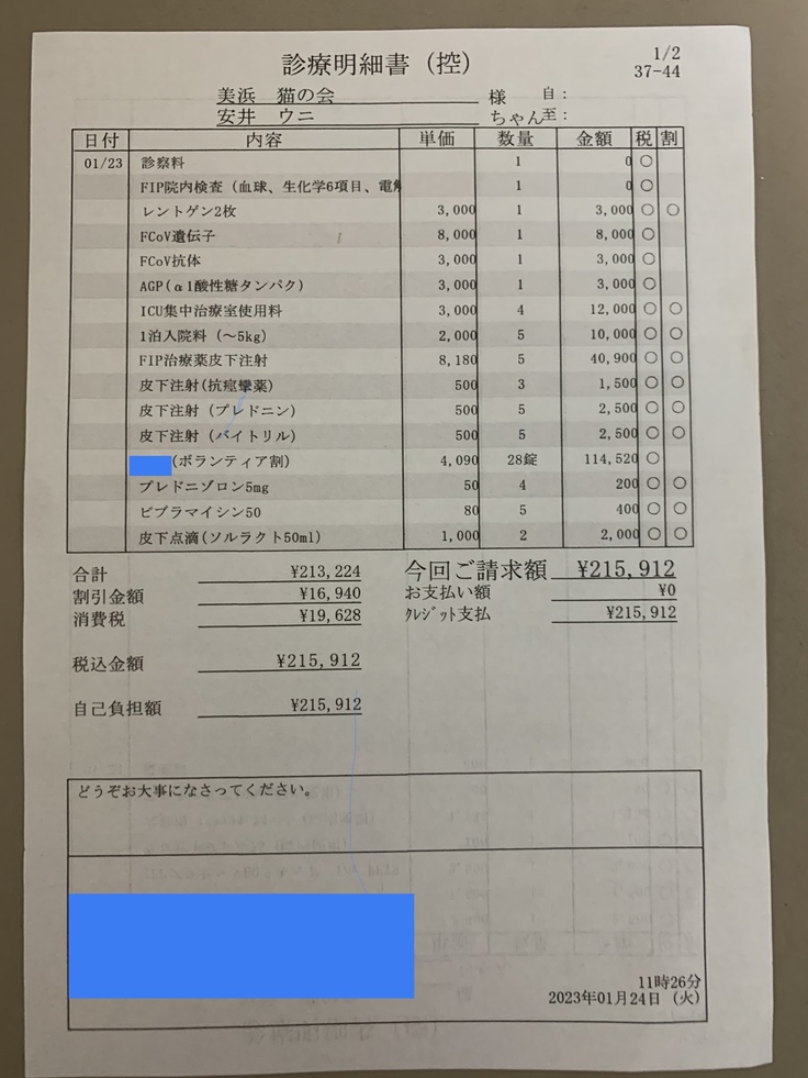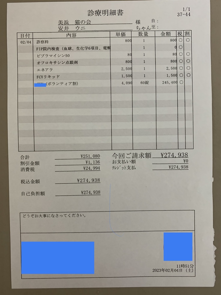 入院費、検査費、FIPに効くとされるお薬(ボランティア割引)サプリメントなどの金額です。