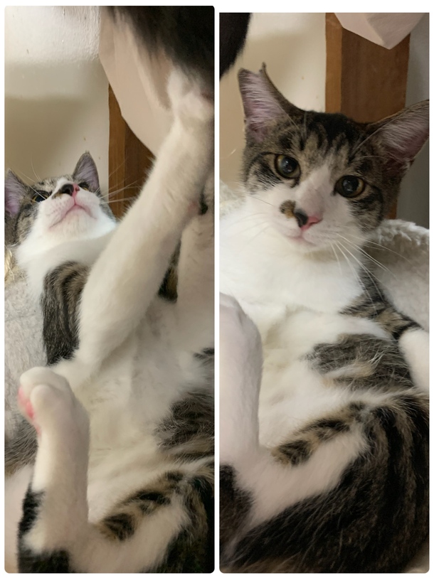 キャットタワーのお気に入りの場所で、同居猫の垂れ下がった尻尾にジャレて遊んでました❤️