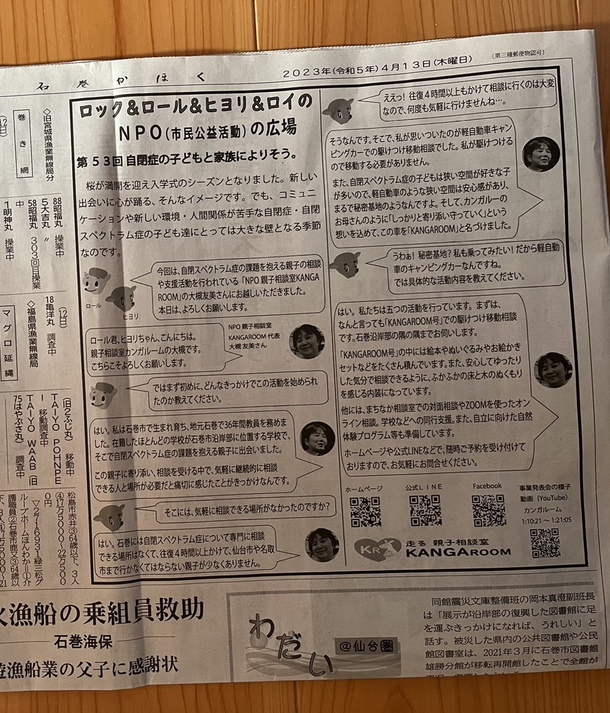 NPO親子相談室KANGAROOMが、本日(4月13日)の地元新聞「石巻かほく」に大きく掲載されました❣️