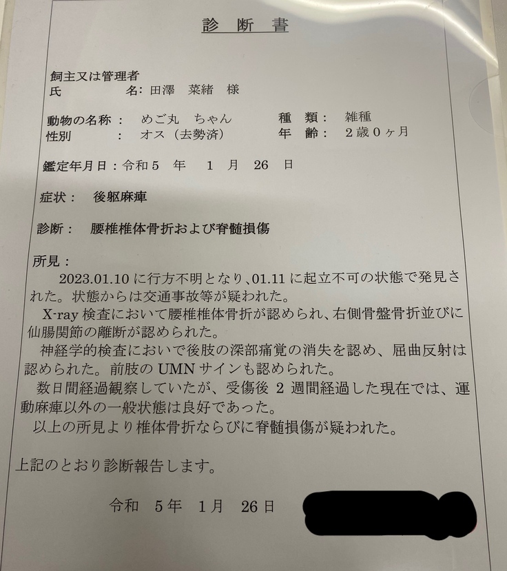背骨と骨盤を骨折しており下半身不随、また前脚もすこし麻痺しているとの診断でした。