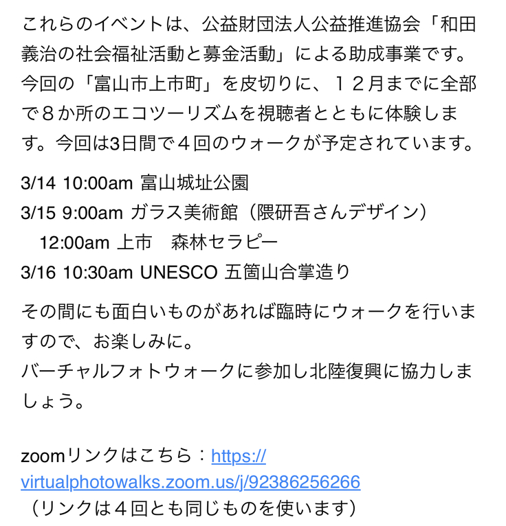 昨年6月に沢山の温かいご支援のもと設立しました和田義治の社会福祉活動と募金活動の基金を通じ、助成させていただいたvirtual photo walk様が北陸応援VPWを明日3/14〜16日に実施しされます。お時間ございましたら、zoomにご参加ください。
