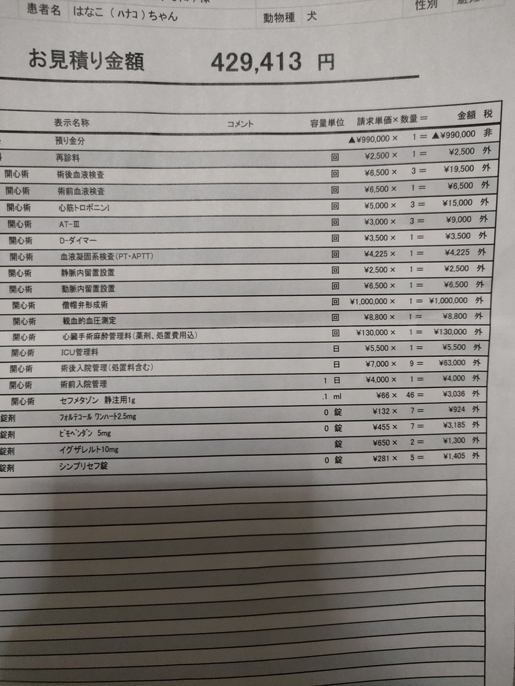 明日、首元の消毒と検査で病院に行きます。その時に残りの代金を支払う流れです