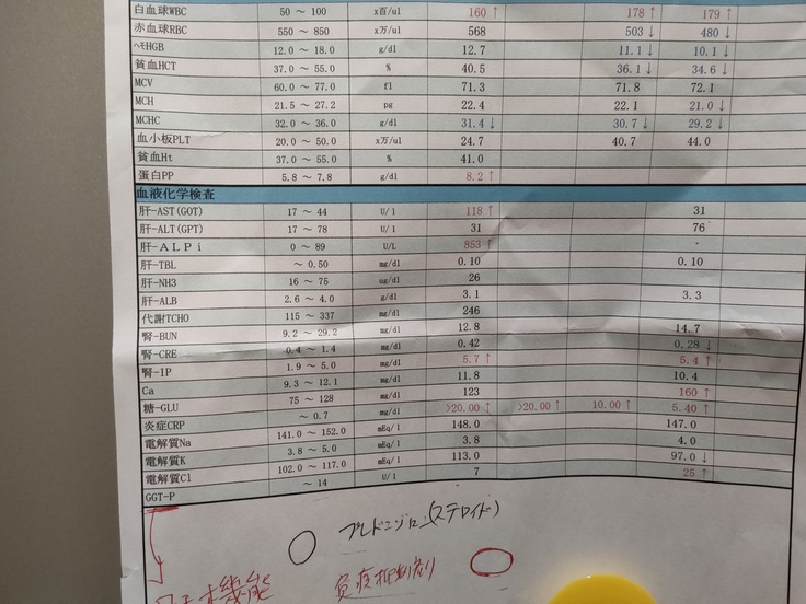 採血結果、炎症反応は下がってはいるものの、数値はまだ高いです