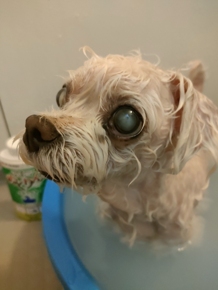 入浴後の写真を✨Goodなカメラ目線です💕 目は全く見えていないですよー 匂いでどこにいるのか、なんとなく分かるんですかね🤔