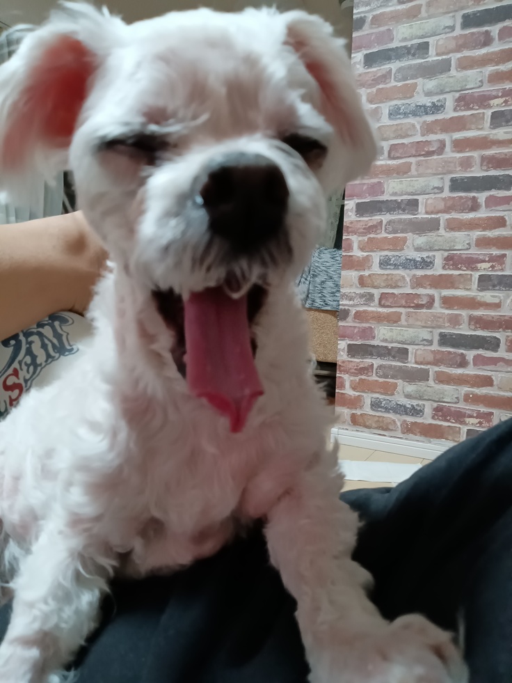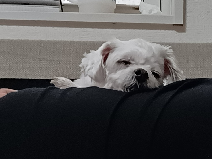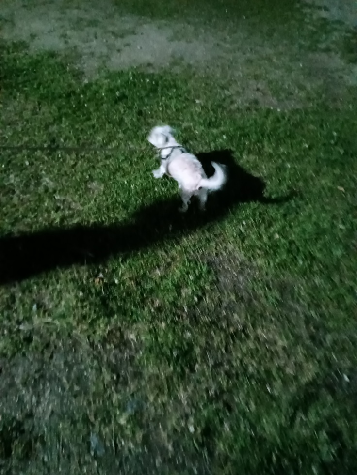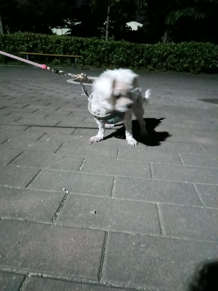 夜のお散歩は怖がって歩こうとしませんでした。尻尾も下がったままな為、抱っこしてお散歩。