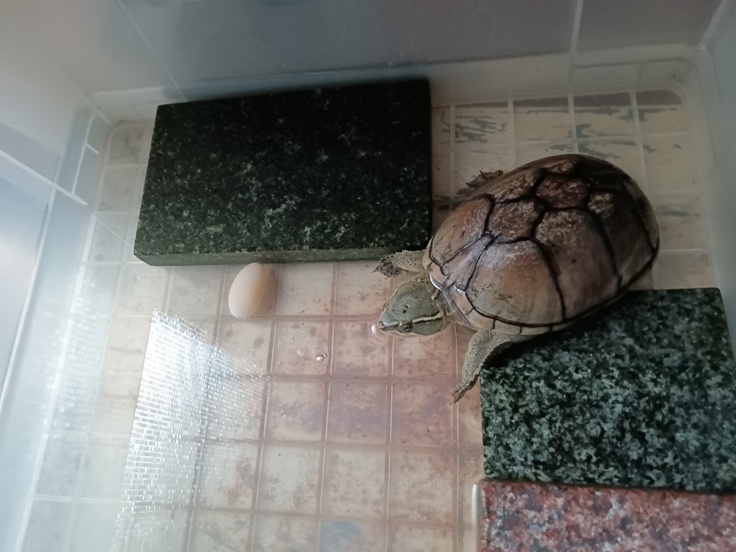 カメ🐢が、こないだ卵を2個産みました。雄がいないので無精卵で産卵時期は4〜6月。