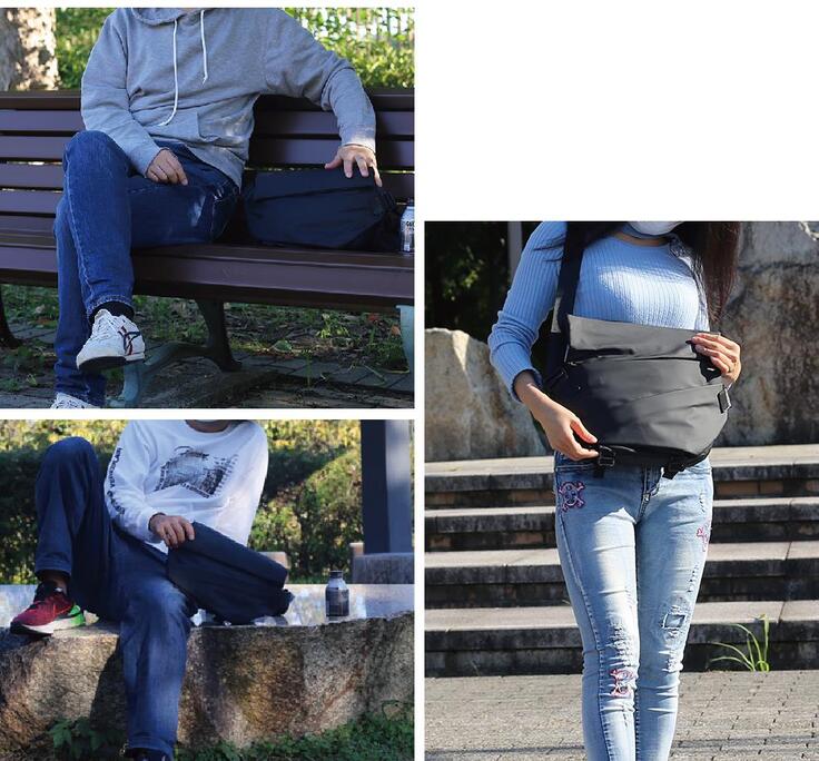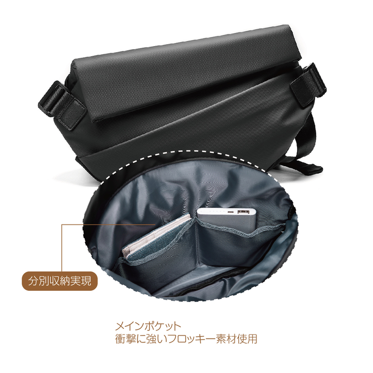 ◯ワンショルダーバッグ感覚で多層収納力、メンポケット中に分別ポケットによる小物を収納可能となり、速やかに出入を可能となります。スリングバッグならではの程よいキャパシティを実現です。
