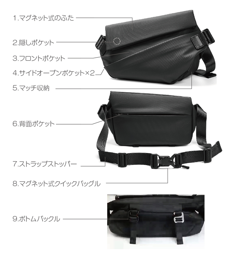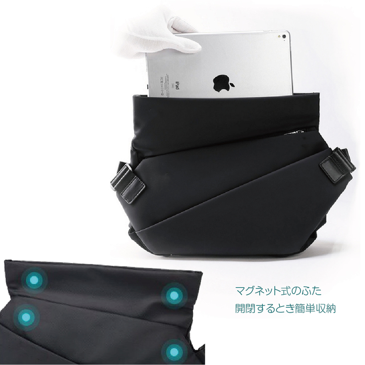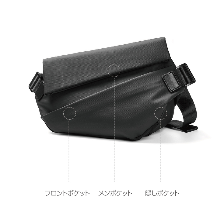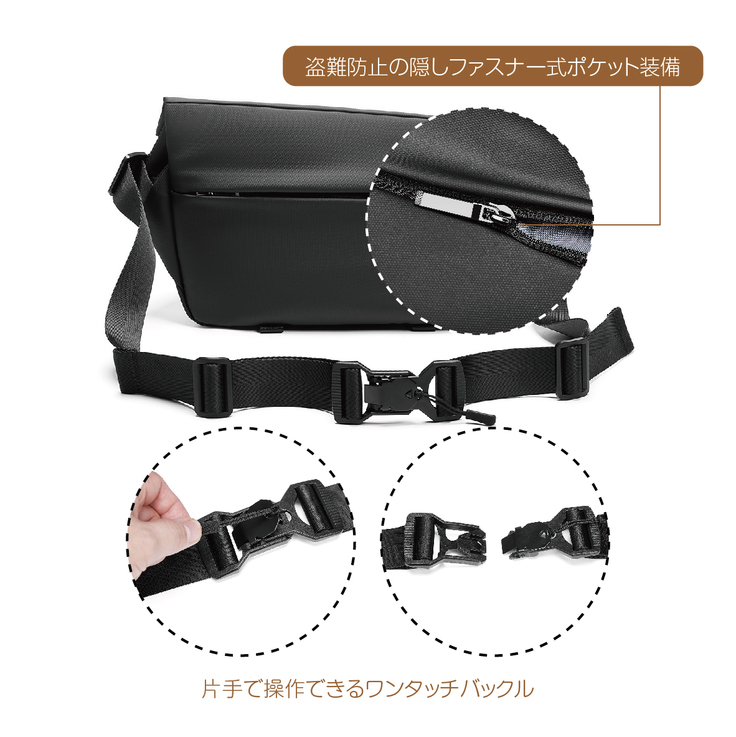 ◯便利な外部ファスナー式ポケット、ボディバッグの裏面にはファスナー式ポケットが付き、頻繁に出し入れの小物(眼鏡、ティッシュ、ハンカチ)など日用品小物入れを分けて収納でき、出張や旅行時に役立つ"程よさ"。