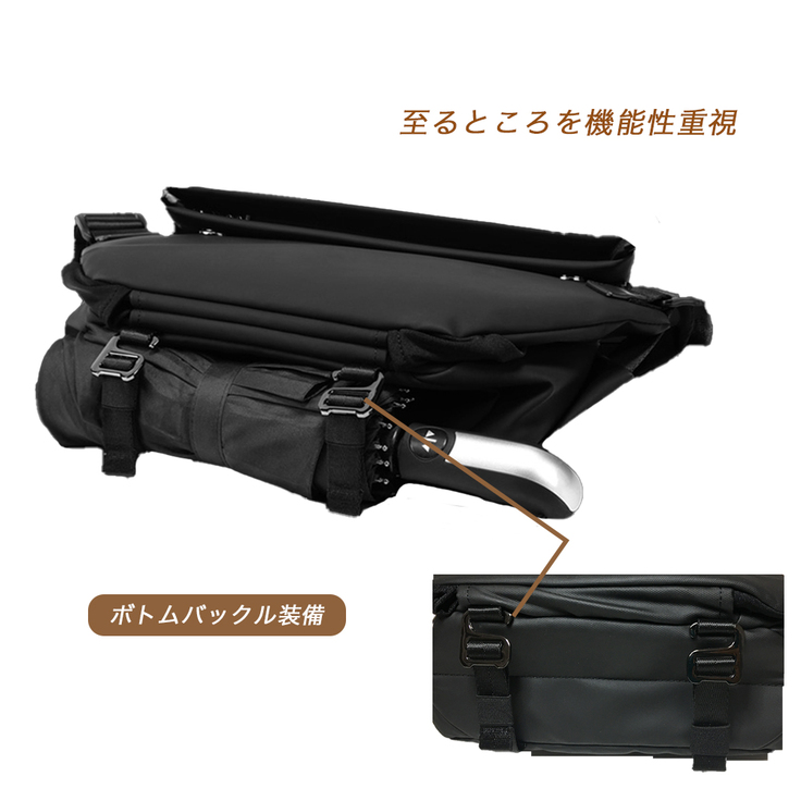 ◯生活防水の加工し、雨の日でも安心できる撥水機能を搭載しております。外付けの傘専用のボトムフック搭載により、乾湿完全分離実現でき、実用性アップです。
