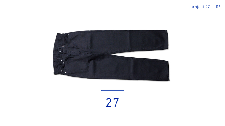 『27』の6着目のリリースとなるVol.06<27-06>は<ブラック・ジーンズ>です。19世紀半ばにアメリカ西部で誕生したとされるブルー・ジーンズ。現在ではファッション・アイテムの定番として世界中で愛用されていますが、その歴史を紐解くと元々は労働者のための労働服でした。20世紀に入り戦後になると政治だけでなく文化としてもアメリカの影響力は強まり、ジーンズを穿いたモデルや俳優たちが(広告や映画などで)世界中に発信され、かつて労働者たちの労働服だったジーンズが流行に敏感な人たちのファッション・アイテムへと変わっていきました。今回『27』がブルー・ジーンズではなくブラック・ジーンズを作る理由はただ一つ。「未来に残る定番品としてのブラック・ジーンズを作りたい」、その想いから究極のブラック・ジーンズをご提案します。