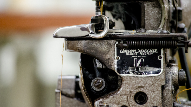 従来のヴィンテージ・ジーンズのように硬くて重いデニムではなく、表情の軽さと伸縮性のあるこの生地を、1940年〜50年代に作られたヴィンテージ・ミシンで縫い上げることは決して容易ではありませんでした。非合理的なヴィンテージ・ミシンを使わなければ表現できない“ネジレ”や“アタリ”といったティテールが『27』のブラック・ジーンズに求められましたが、生地の伸縮性が高くなればなるほどサイズの安定性が低くなるため、縫製職人による細かな工夫と長年の経験で培った技術が必要でした。1950年代の織機で織った生地を、同時期のミシンで縫製することによって豊かな風合いを追求したこのブラック・ジーンズは、いままでに存在しなかった「軽くて柔らかくて新しいブラック・ジーンズ」であると言えます。洗濯と着用によって変化していくあなただけの“シワ”、“ネジレ”、“色落ち”を楽しんでいただける究極のブラックジーンズです。