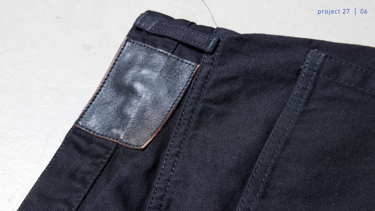 かつて、1953年まではLevi’sもレザーパッチを使用していましたが、54年以降は大量生産で作られた紙パッチを採用しています。今回、『27』のブラック・ジーンズでは、1.5mm厚の馬革(黒染)を使用。職人の幾度にもわたる試作によって複数回洗っても縮まないこと、硬くならず履き心地に影響しないという理由から、馬革を採用することにしました。キメの細かさから伝わる銀面(表面)の高級感と品の良さ、大人の雰囲気といった見た目の良さを感じていただけるはずです。