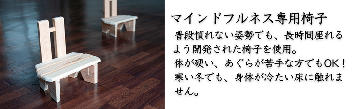 初心者でも迷走がしやすいように開発されたマインドフルネス専用の椅子を使用します。体が硬い方や、あぐらをかくのが苦手な方にも、理想的な姿勢で瞑想を体験していただけます。