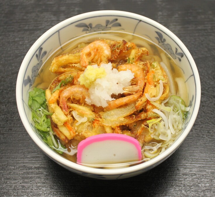 小エビがごろごろ入ったパリッパリの特製かき揚げ、一度食べたら病みつきに。