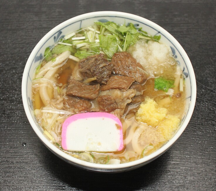 国産黒毛和牛牛すじ肉、地元下小国産こんにゃく、ごぼうを沖縄産黒糖と地元ヤマキ醬油で3時間煮込んだ具材をトッピング。