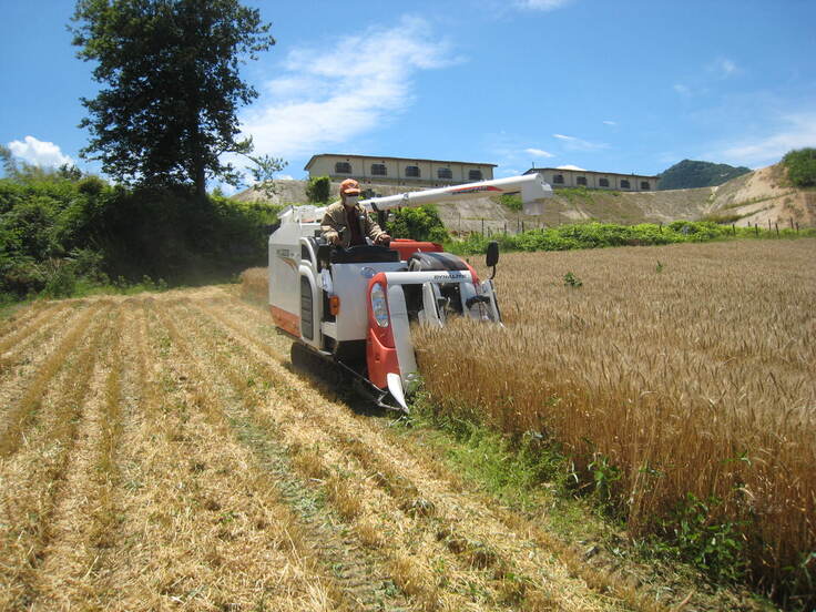 上の耕作放棄地から下の麦畑に転換して作付けした小手姫うどんの原料である小麦(きぬあずま)の収穫風景です。
