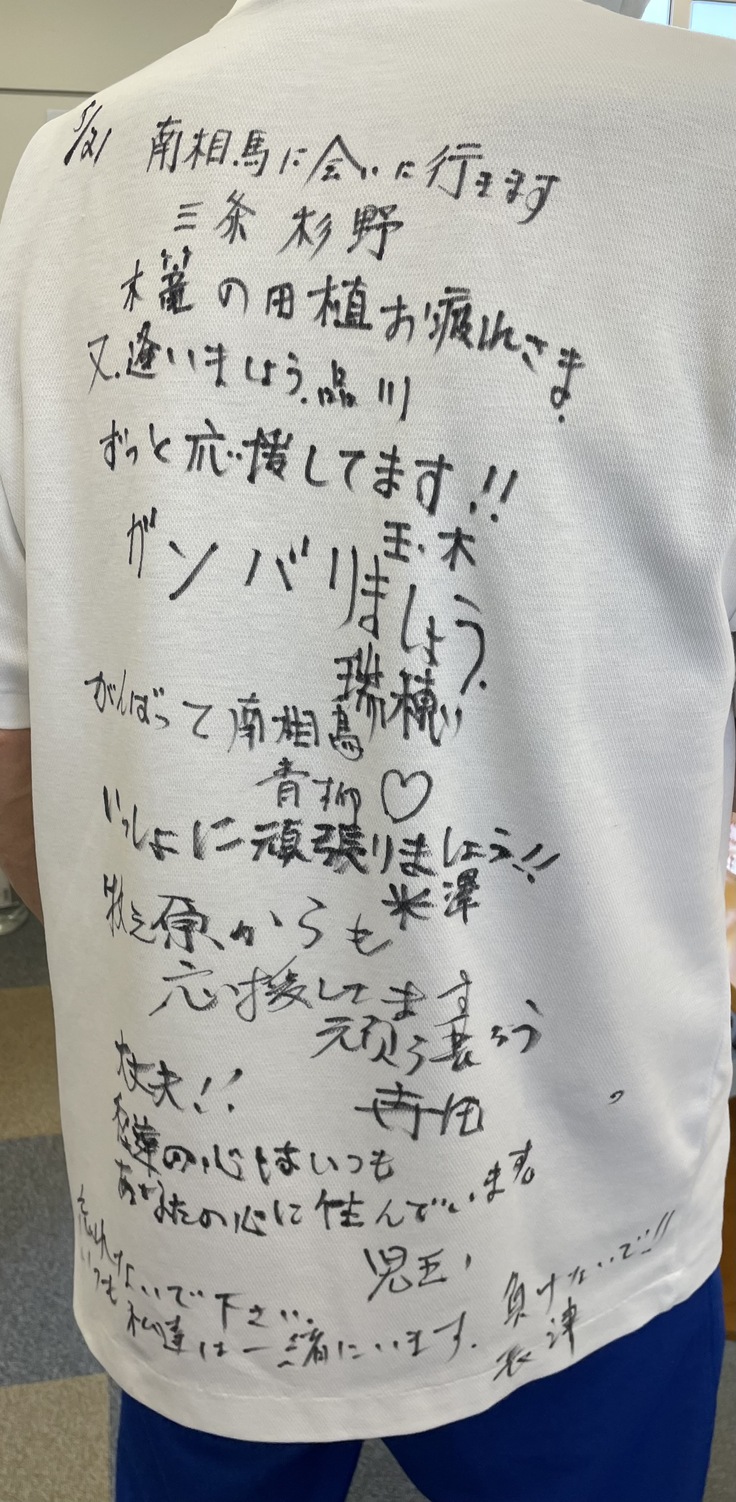 「このゆびとまが出来たからね。私は住民同士の助け合いの気持ちは無くなってないと思うよ、応援してくれた人から頂いた恩をちゃんと次の人に送りたいからね」を笑顔でTシャツを見せてくれた。