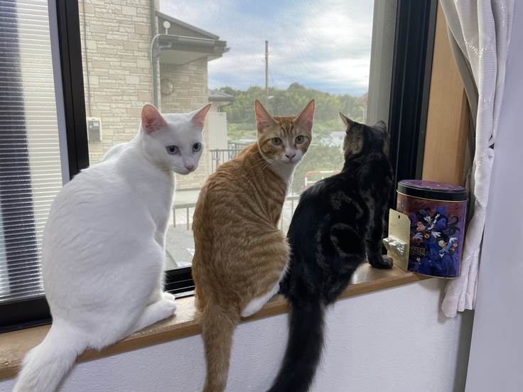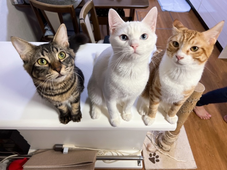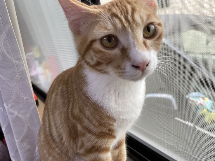私が歩く度についてきて姿が無くなるとずっとにゃーにゃー鳴く甘えん坊です。いつも膝の上で私の顔を見ては、お手手を伸ばしてきて頬でモミモミしてくれるかわいい子です。