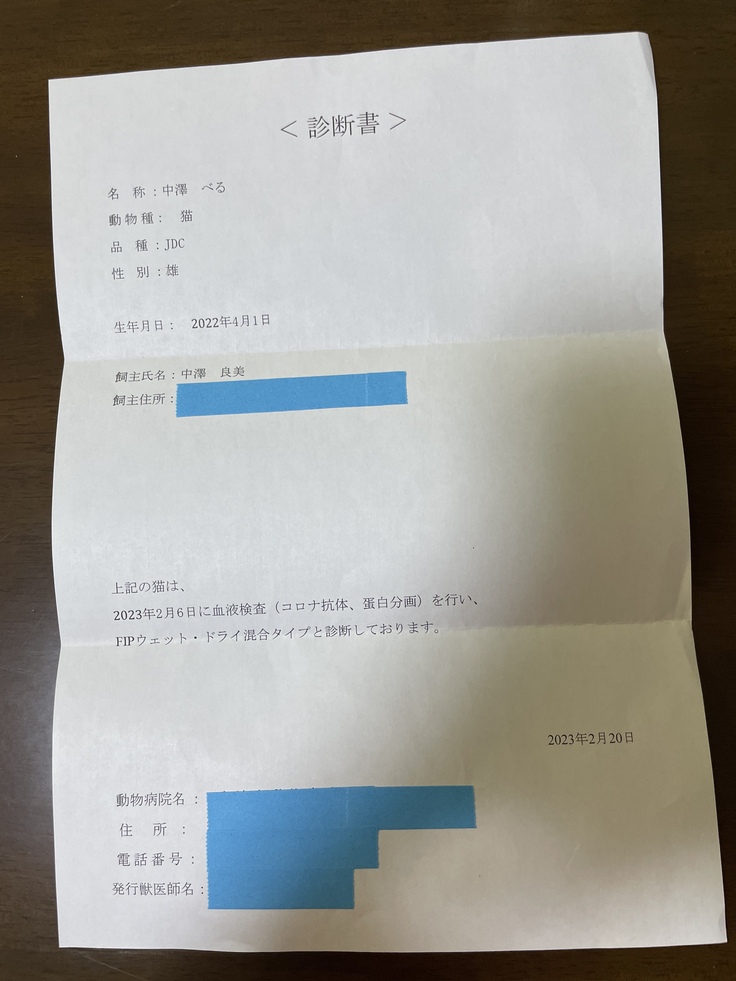 「黄疸、脱水、貧血などの症状も表れ始め状態は酷くなっていて、何かあるかもしれないから血液検査をしましょう」とのことで検査をした所、FIPの疑いがあると言われました。さらに猫コロナウィルス+蛋白分画という検査をし、結果は後日になると言われ、脱水も酷かったのもあり、その日は皮下注射してもらい一度帰宅しました。