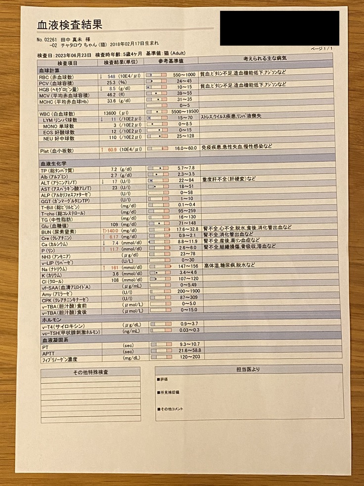 血液検査をしたところ、腎臓の数値が非常に悪く、先生には口から泡を吹いてご飯を食べられない状態でもおかしくない。なぜこんなにケロっとしているのか不思議だと言われました。おそらく生まれつきの病気で慣れているのだろうとのこと。先生の見立てだと腎臓低形成の疑いだそうです。