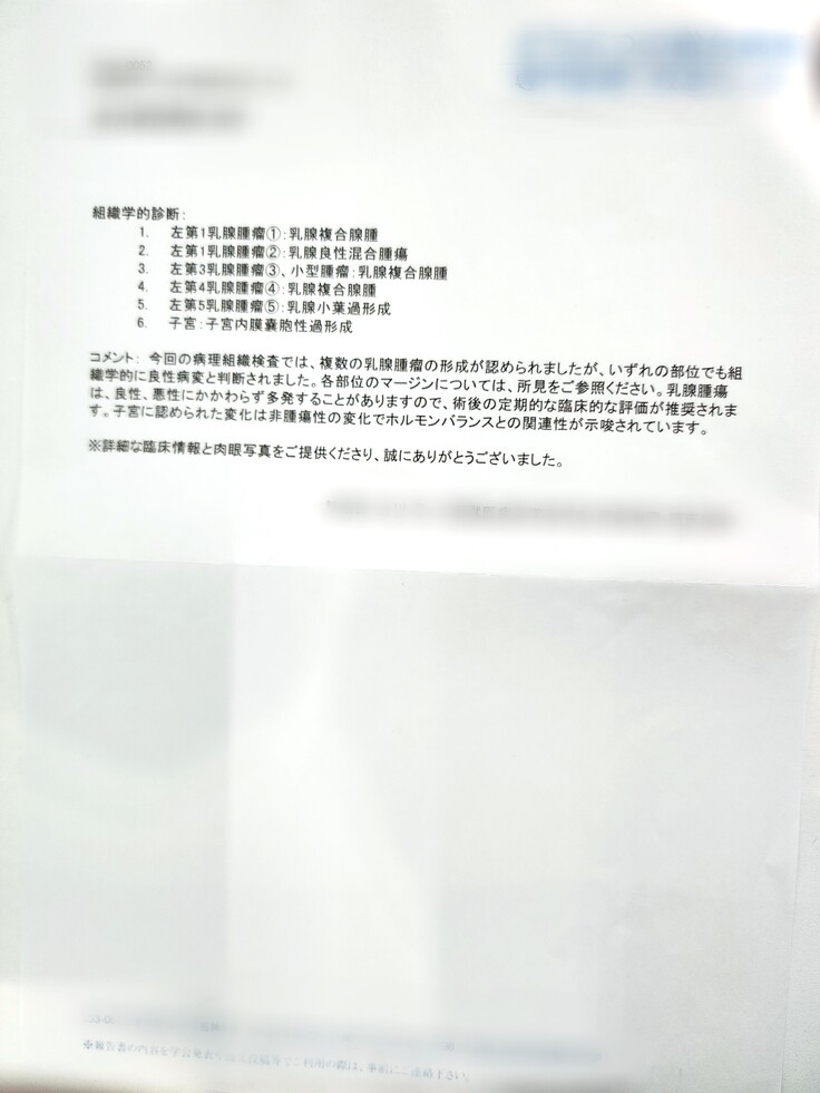 左乳腺腫瘍の摘出手術が無事に成功し、良性腫瘍という安心がありました。
