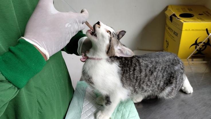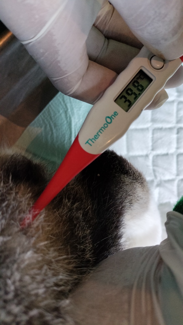 やはり熱があり、獣医さんに熱を下げる注射を打って貰い、ビタミン剤を飲ませてシリンジでウエットフードを溶かして食べさせて貰い、抗生剤とビタミン剤を処方していただき帰って来ました。