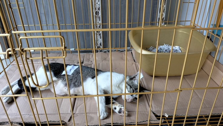 ママ猫の避妊手術後、ハウスで一泊させようと連れて帰りましたが、麻酔から醒めもうろうとする中ケージの中で暴れ口呼吸になり、心配で保護施設に連絡を入れて一泊させてもらえるようお願いし預かって貰っています。