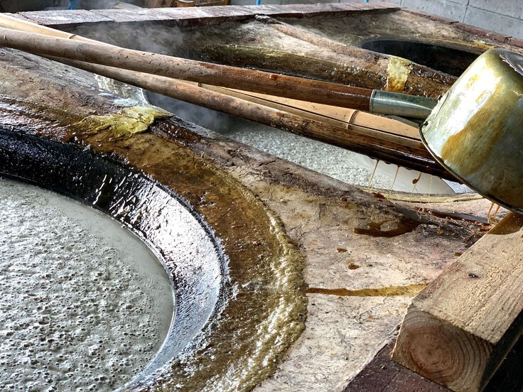 さとうきびはきれいな緑色で一見竹にも似ています。パンパンに水分を含んだ幹を専用の機械を使用し汁を抽出。その後、じっくりと汁を煮詰め濃度を高め、型に流し込み黒砂糖を作ります。