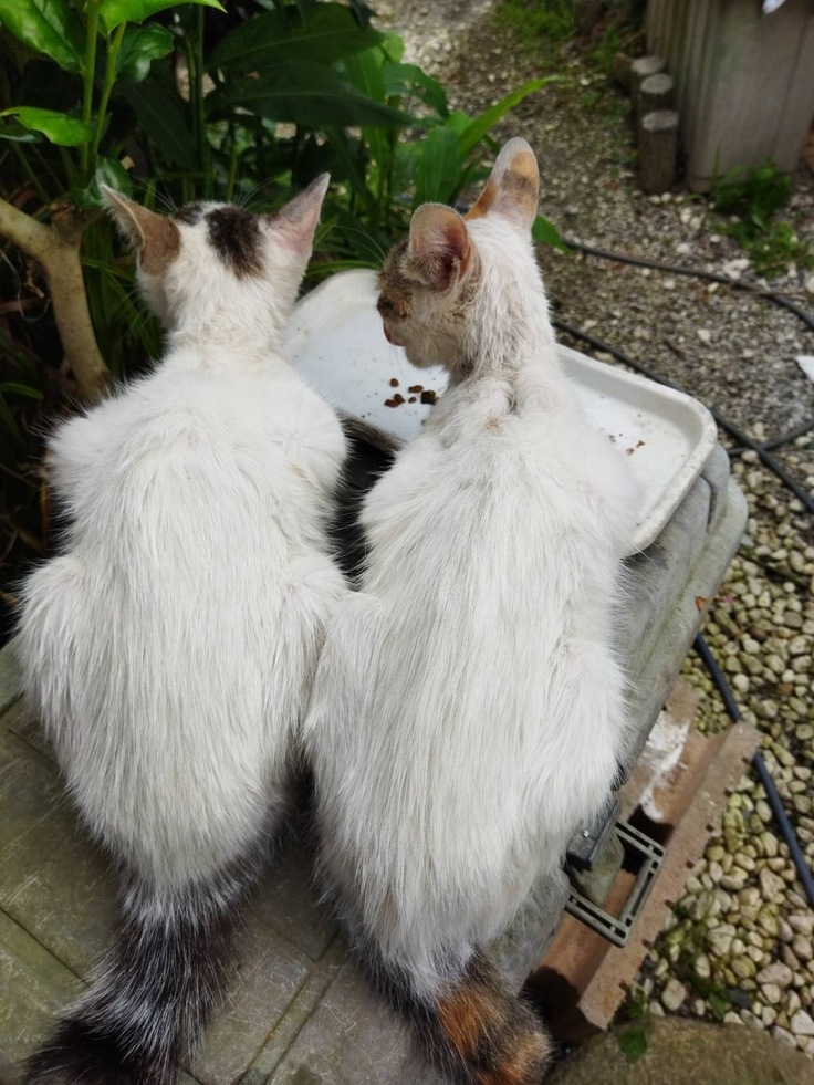 身体がふっくらとし毛並みも良くなりました。2匹とも身体が小さかったので子猫の兄弟かと思いましたが、病院で診て頂いたところ親子でした。去勢済みです。