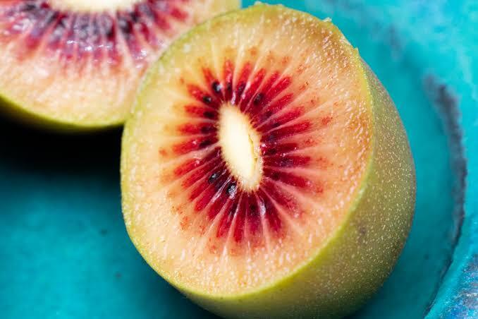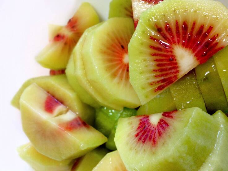 ルビーレッドの果実はゼスプリ・グリーン(ヘイワード種)よりも小ぶりで果実表面は産毛がなくさらっとしている。果皮の色は緑の地色にサビ状に褐色が混じっています。