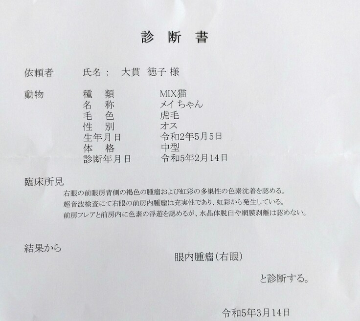 そんな中、一番元気で一番愛想のよい唯一の男の子「めい」の右目が、