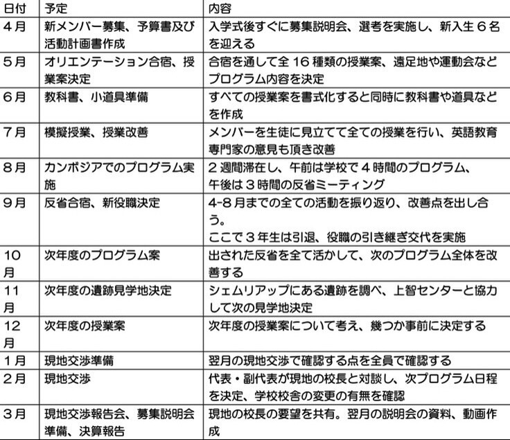 7.そして大学が春休みに入った2月には、2年のチーフと1年の次期チーフが再びカンボジアに出向き、次年度のプログラムに向けての現地交渉を行います。現地交渉では、昨年度のプログラムの所感についてお互いが共有をし、次年度のプログラムの日程や、生徒の人数、改善点などについても話し合いをします。