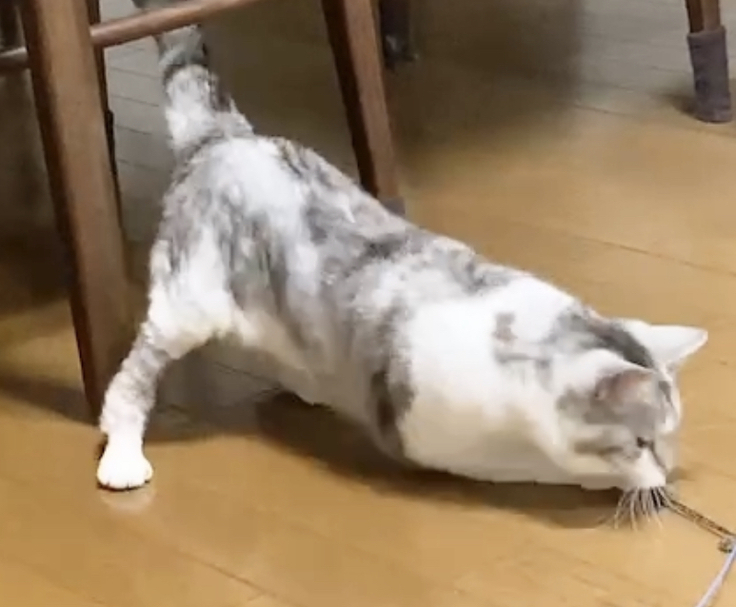 ママが見ていられる時はなるべく包帯を外して、遊ばせたりグルーミングさせたりしています。その姿はまるでズボンを履いた猫!