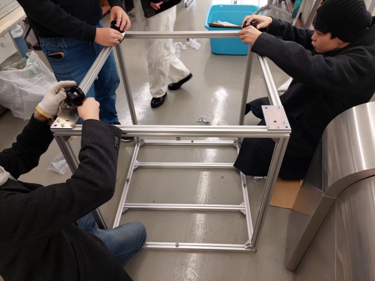 下の写真は、水流し実験で使用する試験台を組み立てている様子です。メンバが試験台の設計して、組み立てまで行いました。