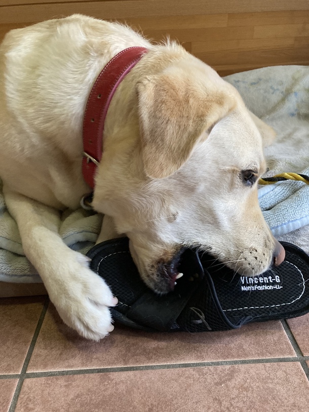 昨日は一日雨だったので憂さ晴らしに父のサンダルをかじってストレス発散していたはなちゃんでした。